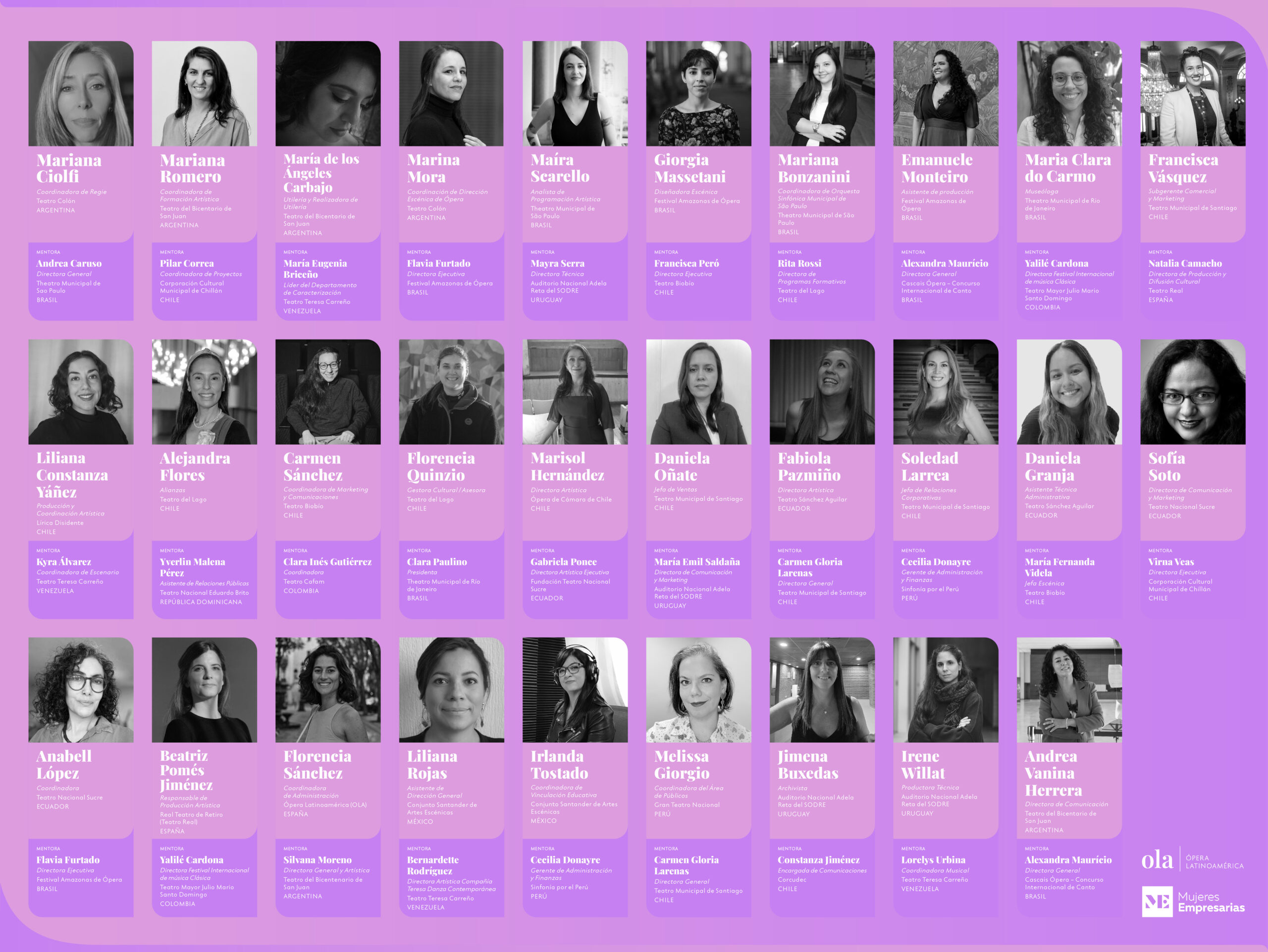 Las 29 mujeres seleccionadas como guiadas –o mentees– para el Programa de Mentorías del Foro de Mujeres de OLA se convertirán en la primera generación de mujeres que recibirán orientación y capacitación por parte de las mentoras y líderes de teatros iberoamericanos pertenecientes a la red de Ópera Latinoamérica (OLA).